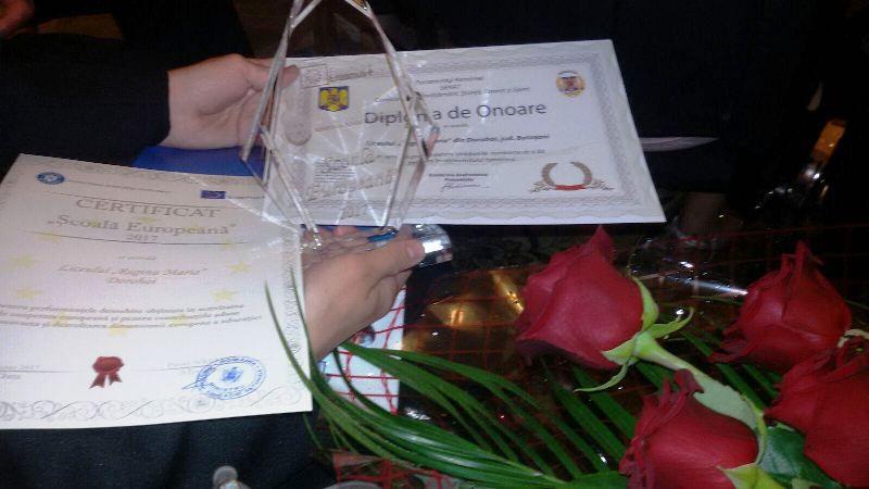 După ce, în urma evaluării, a obţinut al patrulea punctaj pe ţară (174 puncte din 200 posibile), Liceul „Regina Maria” a primit certificatul şi trofeul Şcoală Europeană într-un cadru festiv şi emoţionant.