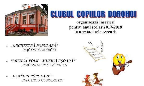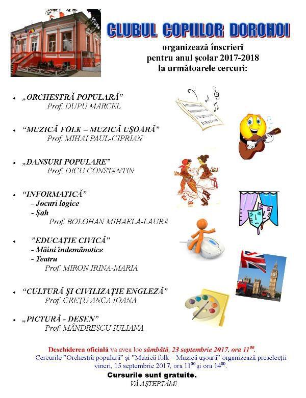 Începând cu vineri, 1 septembrie 2017, între orele 08:00-16:00, copiii și elevii din municipiul Dorohoi şi localităţile alăturate sunt aşteptaţi la Clubul Copiilor Dorohoi pentru înscrierea la cercurile care vor funcţiona în acest an școlar: