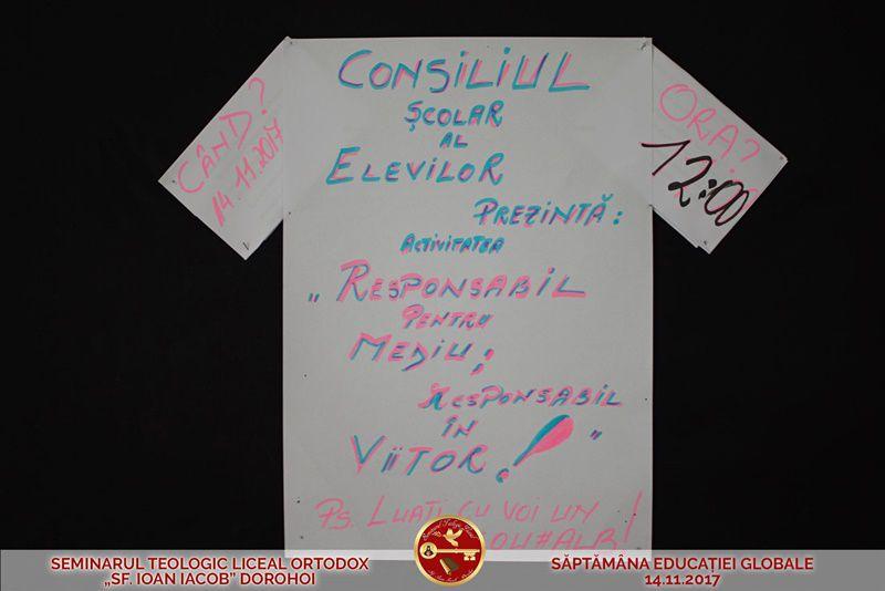 La Seminarul Teologic Liceal Ortodox „Sf. Ioan Iacob” din Dorohoi, marți, 14 noiembrie 2017, s-a desfășurat activitatea „Responsabil pentru mediu – responsabil în viitor”, în cadrul Săptămânii Educației Globale care are ca temă „Lumea mea depinde de noi”.