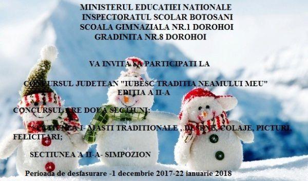 Grădiniţa Nr.8, structură a Şcolii Gimnaziale Nr.1 Dorohoi, vă aşteaptă anul acesta să participaţi la Ediţia cu Nr. 2 a Concursului Judeţean „Iubesc tradiţia neamului meu”, adresȃndu-se preşcolarilor, şcolarilor din clasele pregătitoare şi I-IV, membrilor ai cercurilor artistice din Palatele şi Cluburile Copiilor.