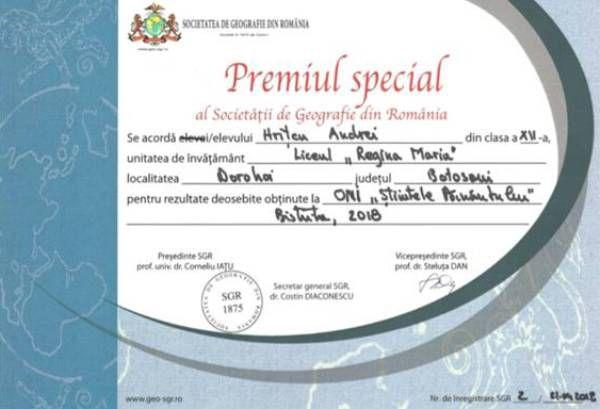 Ca și la ediția precedentă, Andrei Alexandru Hrițcu a obținut un punctaj foarte bun la disciplina geografie (45 puncte din 50), punctaj care i-a adus Premiul Special al Societății de Geografie.