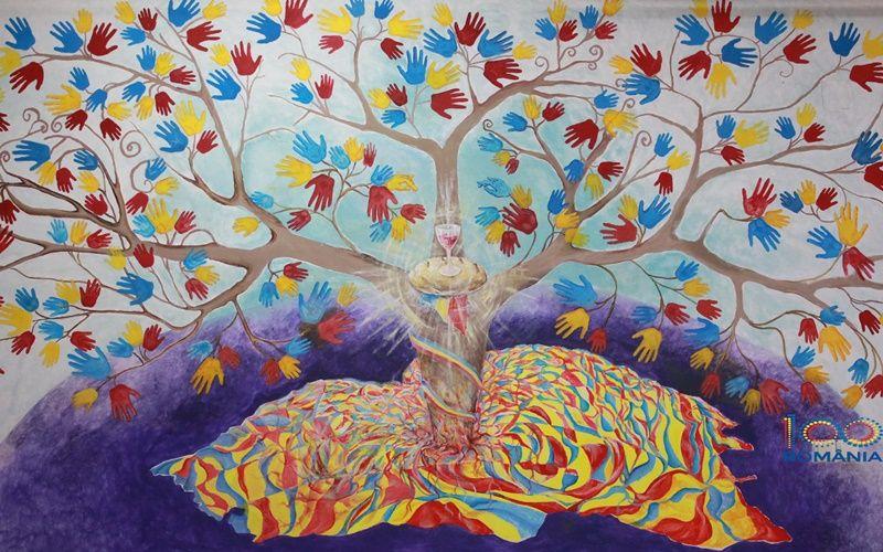 Proiectul, care poate fi admirat la etajul întâi al Seminarului, îmbină numeroase simboluri care atrag privirile tuturor: elementele euharistice, pâinea și vinul, binecuvântate de Mântuitorul Iisus Hristos la Cina cea de Taină, sunt așezate în mijlocul unui pom cu trei brațe, care amintește de Crucea Răstignirii. Pe crengile copacului, în locul frunzelor au fost pictate palme tricolore, care redau ideea de comuniune și unitate. Foarte discret, două palme „binecuvintează” pâinea și vinul, amintind de Liturghia arhierească. Pomul este „sădit” în mijlocul României Mari, arătând apartenența tuturor românilor la Țara mamă.