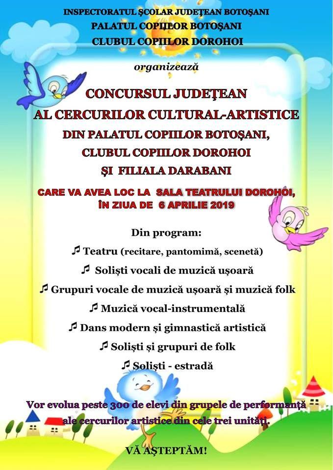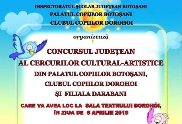 Sâmbătă, 6 aprilie 2019, începând cu ora 10.00, la Sala Teatrului Dorohoi, se va desfășura Concursul Judeţean al cercurilor cultural-artistice din Palatul Copiilor Botoșani, Clubul Copiilor Dorohoi și Filiala Darabani.