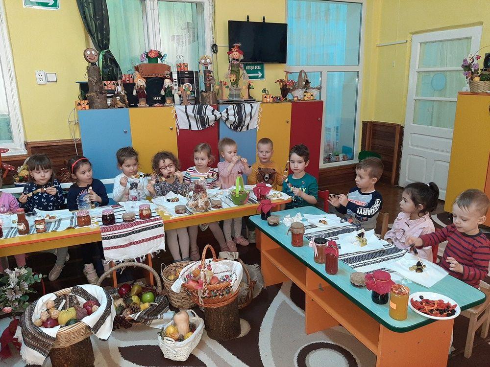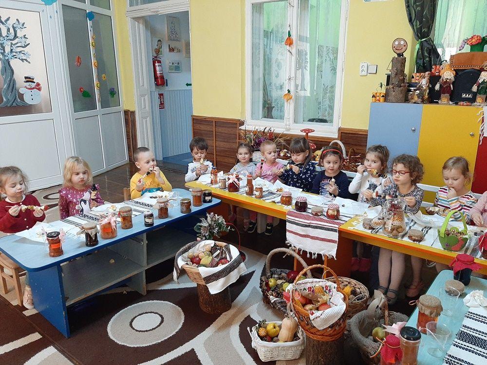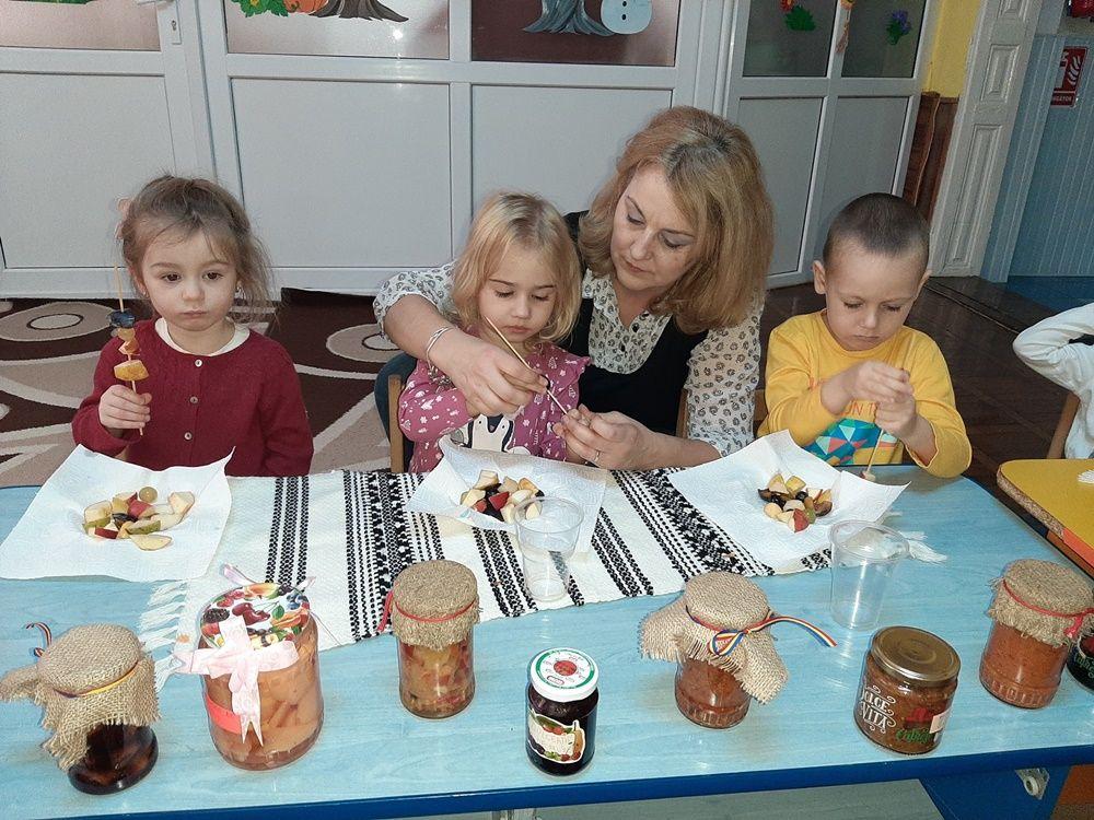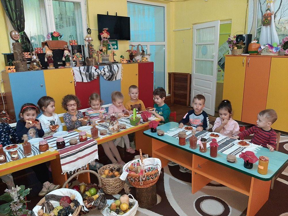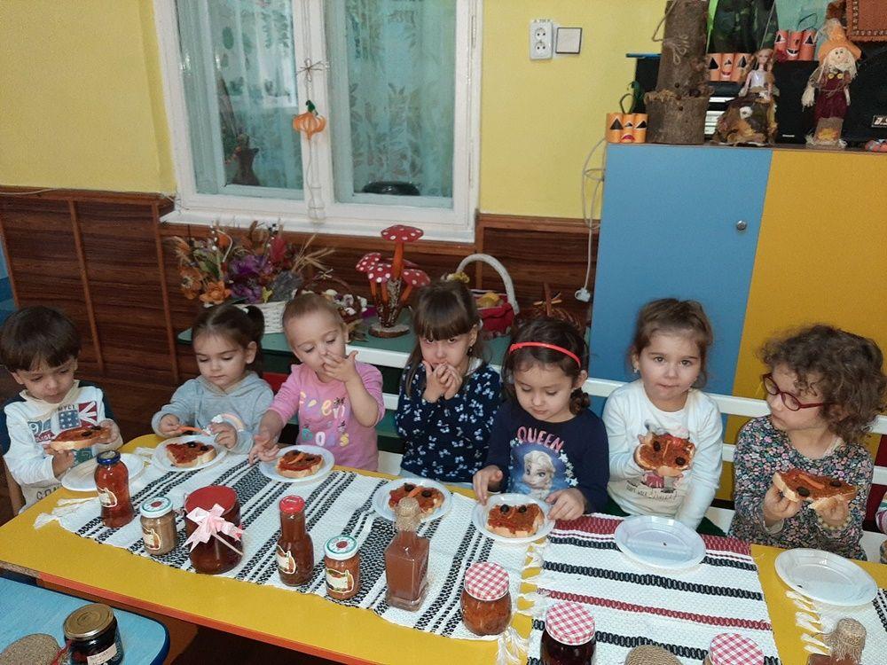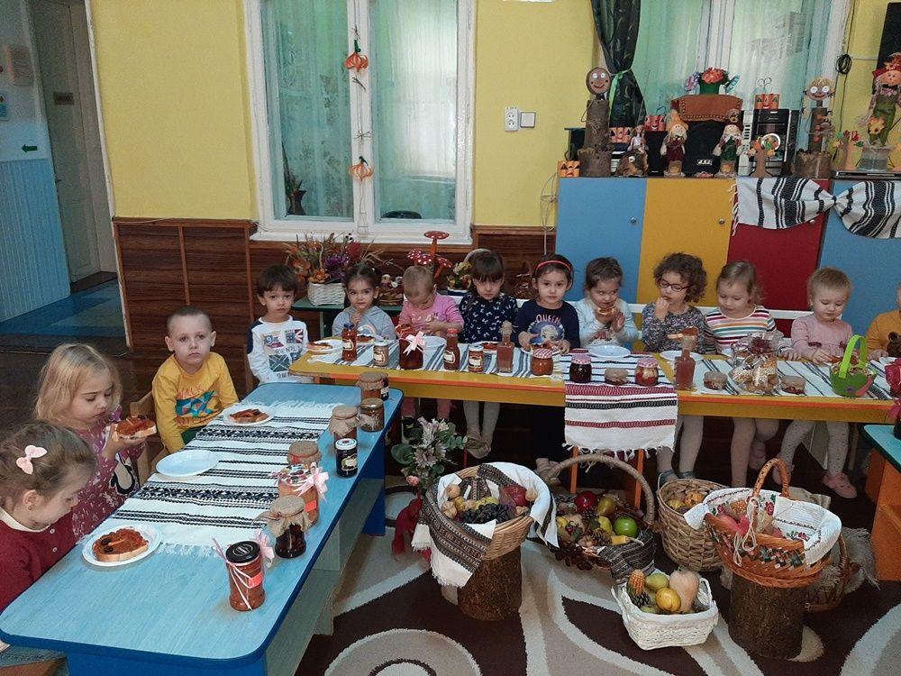 Copiii au observat, recunoscut și denumit fructele și legumele toamnei, apoi au făcut tartine cu zacuscă înfrumusețându-le cu ochi, nas și gură din legume, frigărui cu fructe de toamnă, iar la final le-au savurat până la ultima firimitură. Totodată au gustat diverse sortimente de dulceață și au băut suc natural din fructe. Totul a fost delicios! Activitatea s-a încheiat cu multe zâmbete și cu toții au dansat și s-au bucurat de acest minunat anotimp.