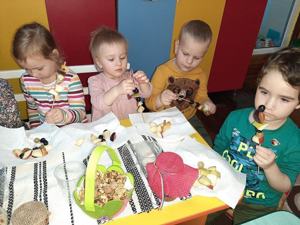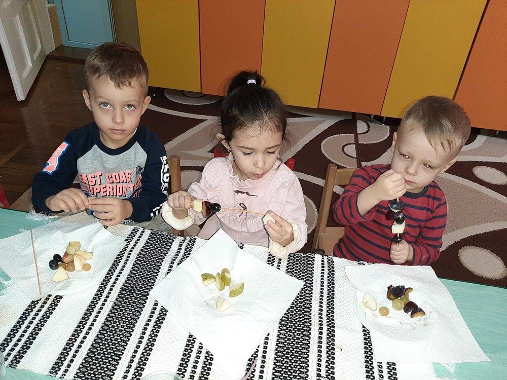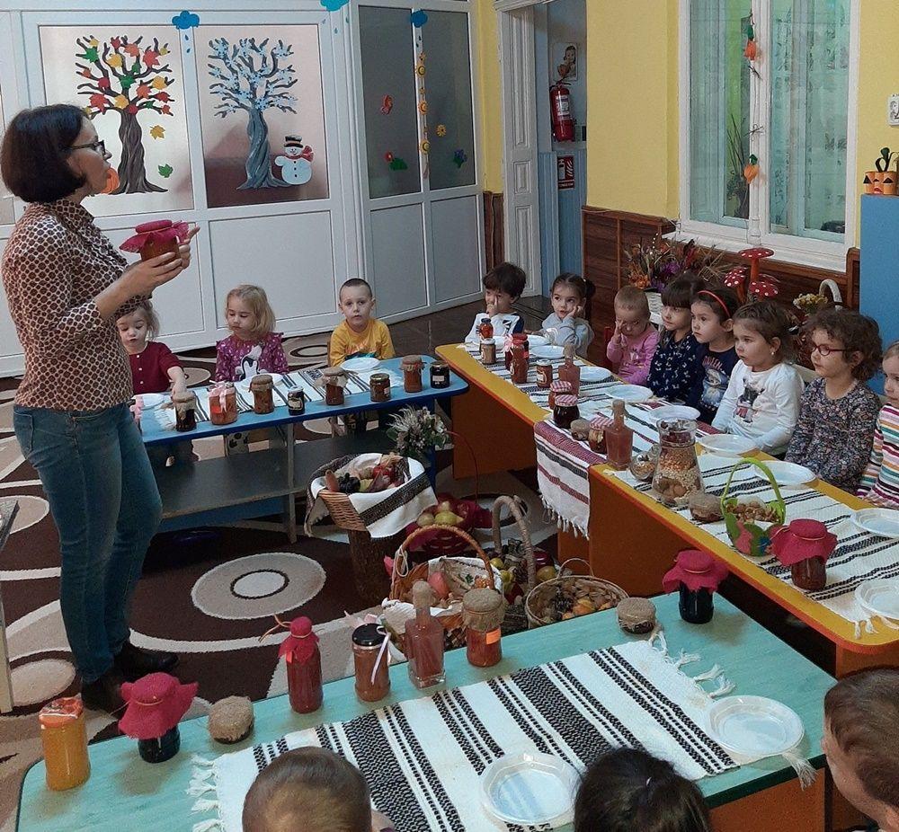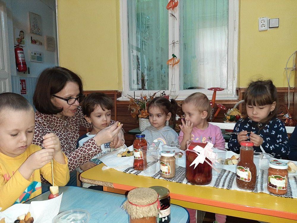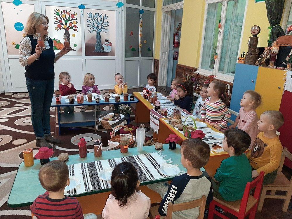 Copiii au observat, recunoscut și denumit fructele și legumele toamnei, apoi au făcut tartine cu zacuscă înfrumusețându-le cu ochi, nas și gură din legume, frigărui cu fructe de toamnă, iar la final le-au savurat până la ultima firimitură. Totodată au gustat diverse sortimente de dulceață și au băut suc natural din fructe. Totul a fost delicios! Activitatea s-a încheiat cu multe zâmbete și cu toții au dansat și s-au bucurat de acest minunat anotimp.