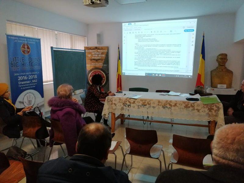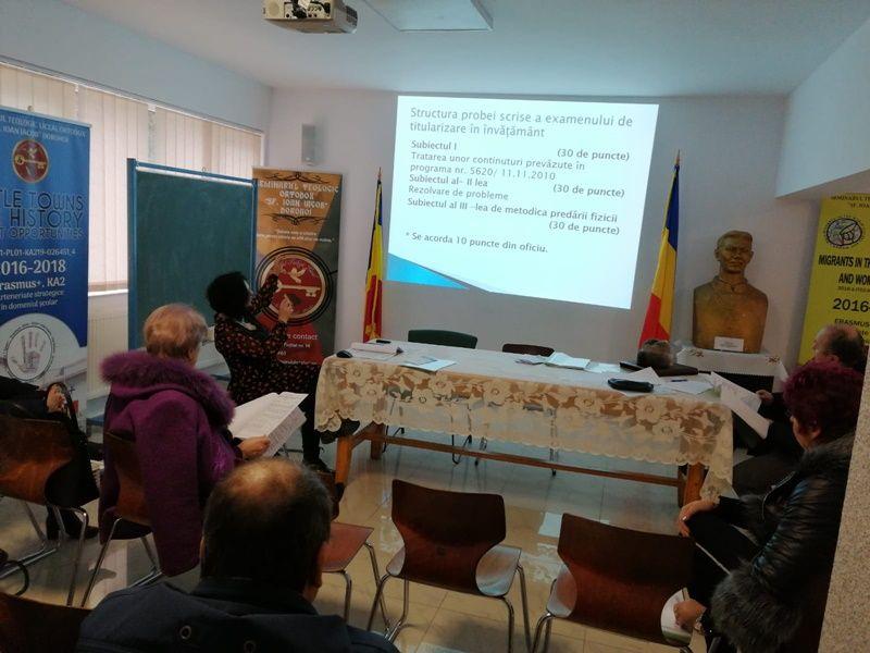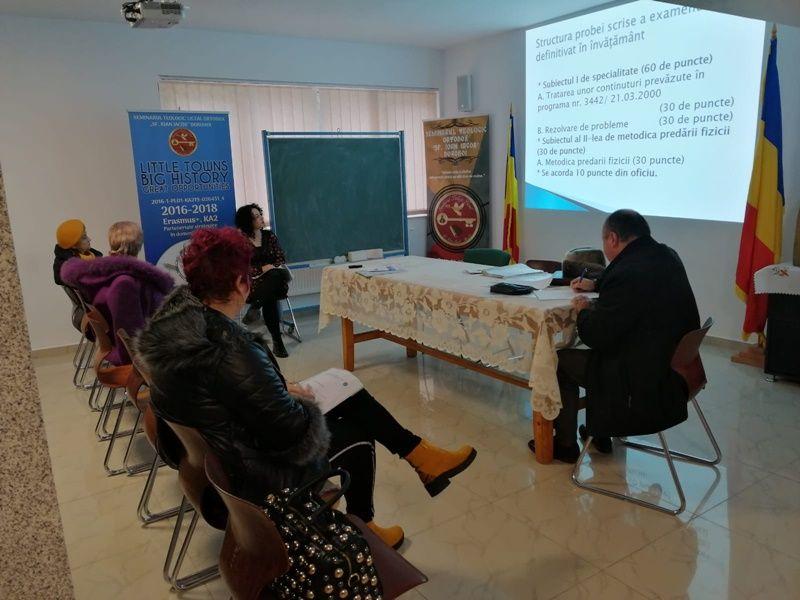 Prima parte a activității, cu tema „Formarea continuă a cadrelor didactice-structura subiectelor date la examenele de definitivare, de obţinere a gradului II şi a celor de titularizare în învăţământ” a fost susținută de doamna Crihan Ana-Maria, profesor de Fizică la Seminarul Teologic Dorohoi.