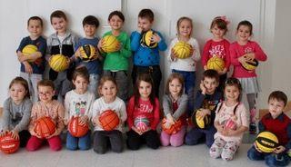 Cu un antrenor și voluntari, copiii învață sportul lor preferat – baschetul.