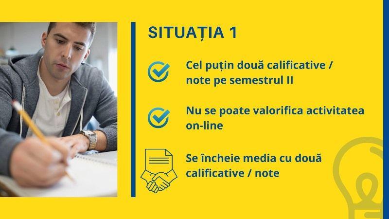 Situația 1: dacă elevul are cel puțin două note în semestrul al II-lea, dar activitatea sa on-line nu poate fi valorificată, atunci situația școlară semestrială se poate încheia doar cu aceste două calificative/note.