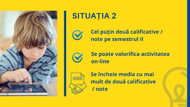 Situația 2: dacă elevul are cel puțin două calificative/note în semestrul al II-lea și i se poate valorifica activitatea on-line, atunci situația școlară semestrială se poate încheia și cu mai mult de două calificative/note.