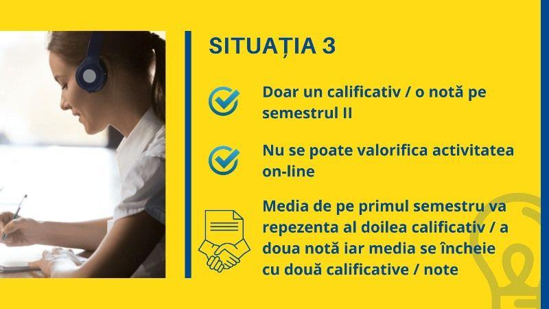 Situația 3: dacă elevul are doar o notă în semestrul al II-lea și nu i se poate valorifica activitatea desfășurată on-line, atunci a doua notă va fi considerată nota care reprezintă media elevului din primul semestru.