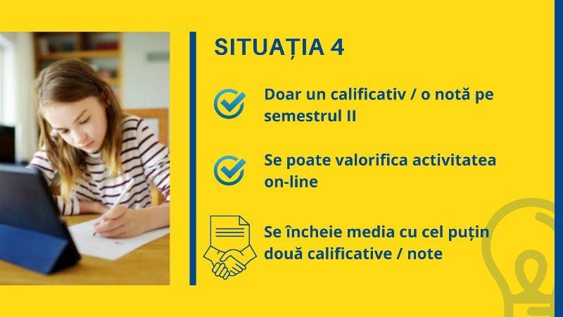 Situația 4: dacă elevul are doar un calificativ/o notă în semestrul al II-lea și i se poate valorifica activitatea desfășurată on-line, atunci situația sa școlară semestrială se poate încheia cu cel puțin două note.