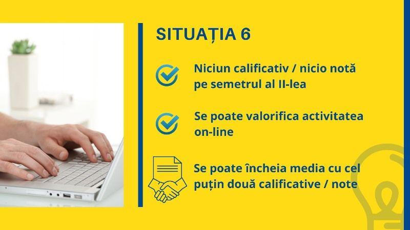 Situația 6: dacă elevul nu are nicio notă în semestrul al II-lea și i se poate valorifica activitatea on-line, atunci situația școlară semestrială se poate încheia cu cel puțin două note.