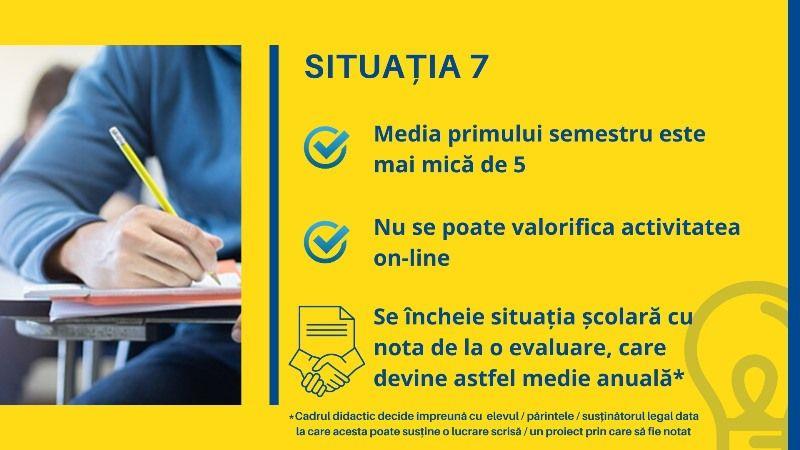 Situația 7: dacă media primului semestru este mai mică decât 5 și nu poate fi valorificată activitatea on-line, cadrul didactic decide împreună cu elevul/părintele/susținătorul legal data la care acesta poate susține o lucrare scrisă/un proiect prin care să fie notat, iar nota la această evaluare devine media anuală.