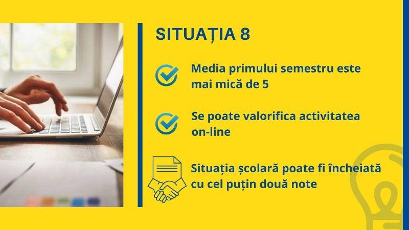 Situația 8: dacă media primului semestru este mai mică decât 5 și se poate valorifica activitatea on-line, atunci media semestrului al II-lea poate fi încheiată cu cel puțin două note.