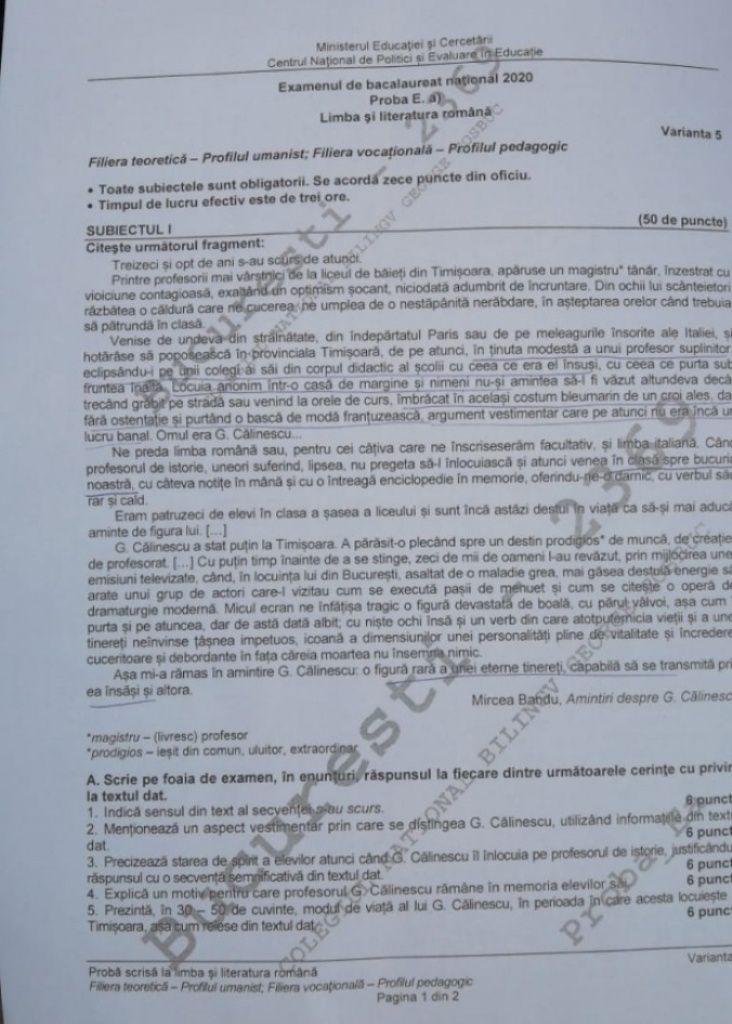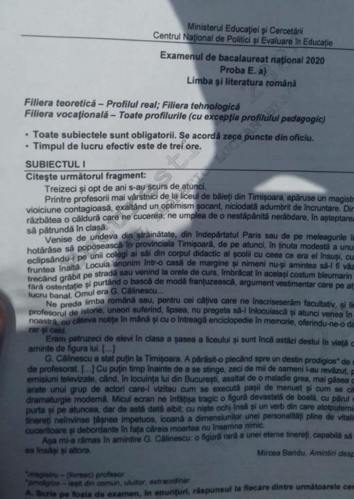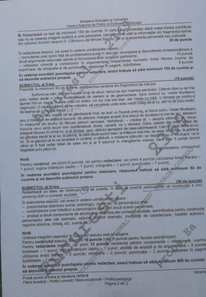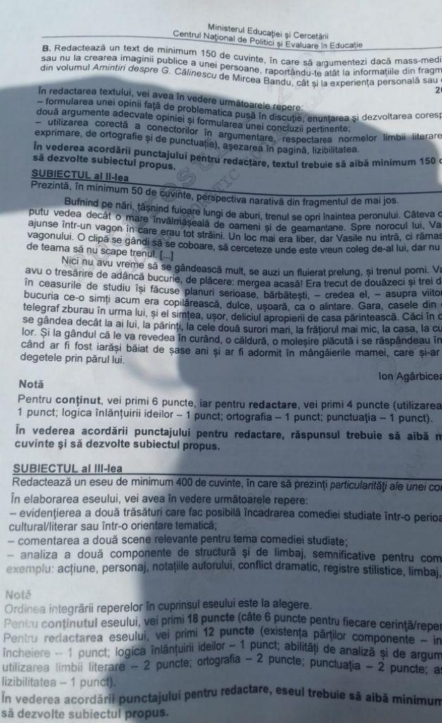 La subiectul trei, la profilul umanist, absolvenții de liceu au avut de redactat un eseu de cel puțin 400 de cuvinte, în care să prezinte particularitățile de construcție a unui personaj dintr-o comedie studiată.