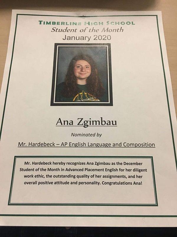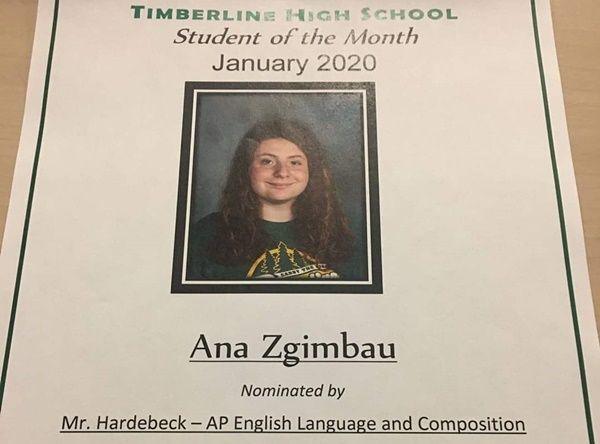 Întoarsă recent din Statele Unite, după un an de studii prin programul FLEX, Anamaria-Teodora Zgîmbău, elevă în clasa a XII-a la Colegiul Național “Grigore Ghica” Dorohoi a cucerit Timberline High School din orașul Lacey, statul Washington, situîndu-se pe primul loc dintr-un număr de 382 de elevi.