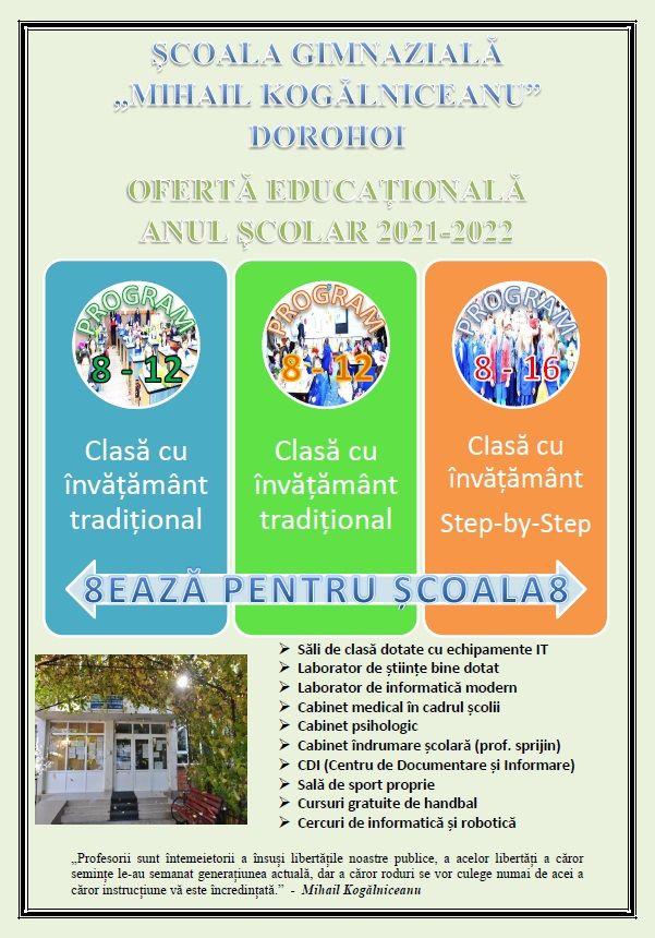 În anul școlar 2021-2022 Școala Gimnazială „Mihail Kogălniceanu” Dorohoi va avea două clase pregătitoare cu învățământ tradițional și o clasă pregătitoare Step by Step.