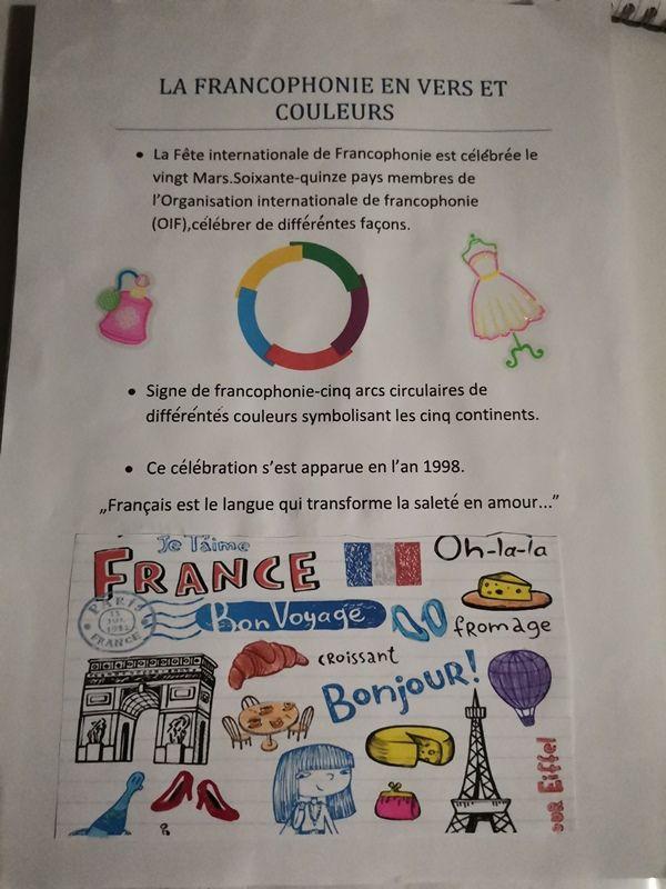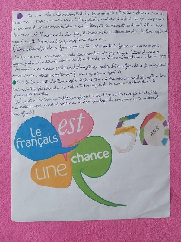 În săptămâna 15-20 martie elevii claselor a V-a C și a VI-a B, îndrumați de doamnele profesoare Găbinat Elena-Luiza și Pânzaru Ecaterina, au căutat informații referitoare la semnificația Francofoniei, care sunt țările francofone, au realizat proiecte referitoare importanța faptului că suntem o țară francofonă, manifestându-și talentul creativ și sentimentele prin încărcarea pe platforma școlii a unor poezii preferate, inserarea de imagini sau descrierea unei personalități reprezentative /a unui monument, utilizând limba franceză.
