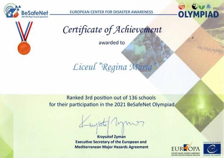 Cel mai valoros rezultat a fost obținut la BeSafeNet Olympiad 2021 – Medalia de bronz - de către echipa formată din MUNTEANU RADU OVIDIU, MURĂREANU LUCIANA DUMITRIȚA, ȚOȘU COSMINA DIANA, ȘOLTUZU EMANUEL, sub coordonarea prof. Geanina Gheorghiță. Elevii merituoși ai Reginei au făcut față cu brio la competițiile de lingvistică, geografie, matematică, informatică, fizică.