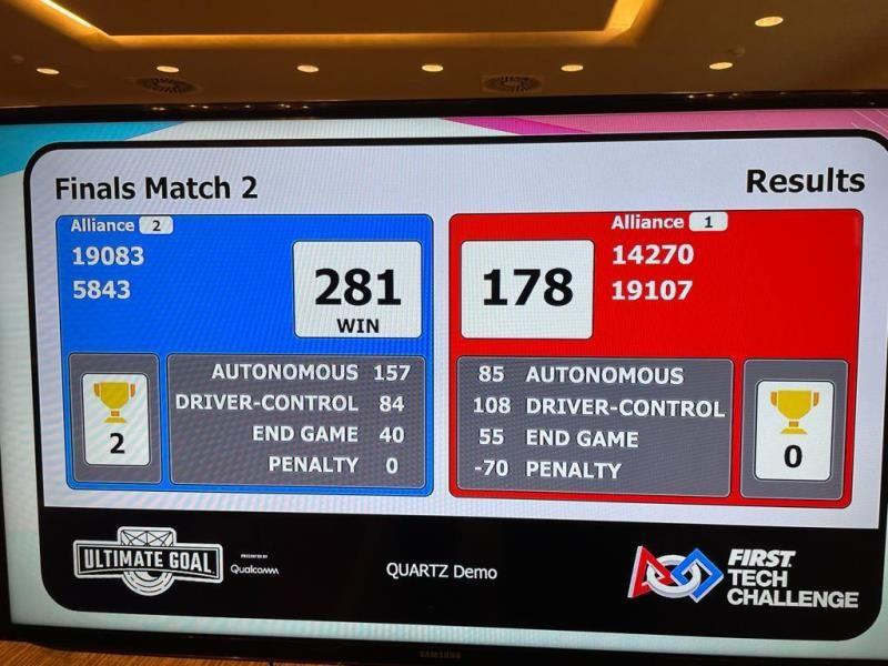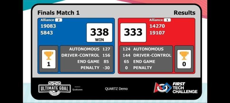 În finală, s-au jucat două meciuri: prima alianță de culoare albastră formată din North East Dynamics (Dorohoi) și Autovortex (București), iar cea roșie din Quantum Robotics (București) și Fuse Robotics (Iași). Ambele meciuri au fost câstigate de alianța albastră cu punctaje considerabile 338 de puncte, respectiv 281, adversarii obținând 333, respectiv 178.