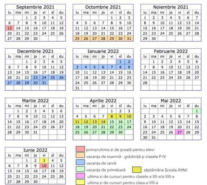 Anul şcolar 2021-2022 începe pe 13 septembrie 2021 pentru elevi şi se încheie pe 11 iunie 2022, are 34 de săptămâni, potrivit Ordinului de ministru nr. 3.243 din 5 februarie 2021. Este împărţit în două semestre şi trei vacanţe, din care două pentru toţi elevii, plus o vacanţă pentru elevii din ciclul primar şi copiii de la grădiniţă, fiind unul dintre cei mai scurți ani școlar din istoria recentă. Pentru a putea fi la îndemână şi mai util, Edupedu.ro a pus într-o formă simplă calendarul anului şcolar 2021-2022, astfel încât să poată fi descărcată, salvată în calculator sau chiar imprimată.