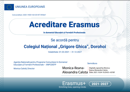 În perioada 5 - 16 iunie 2022, 18 elevi de la specializarea matematică-informatică și un profesor de informatică au participat la mobilitatea proiectului Erasmus+ VET 2021-1-RO01-KA121-VET-000010070, finanțat de Comisia Europeană cu 45930 Euro, acesta fiind al doilea proiect de acest tip implementat în Colegiul Național „Grigore Ghica” în acest an. Acest proiect se derulează în cadrul acreditării Erasmus+ 2020-1-RO01-KA120-VET-095667 în domeniul formării profesionale, acreditare obținută de școala noastră valabilă în perioada 2021-2027.
