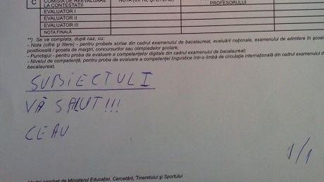 "Vă salut!!! Ceau" este tot ce tânărul absolvent de liceu a scris pe foaia de examen, motiv pentru care a fost notat cu 1, potrivit informatiadebihor.ro.