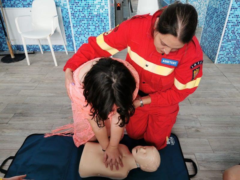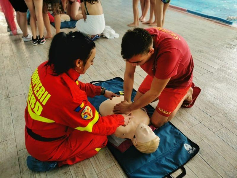 Cu ajutorul manechinelor, Mirabela Ciaia și Simona Cărbunaru, voluntari în cadrul programului național „Salvator din Pasiune”, i-au învățat cum să execute corect manevrele de acordare a primului ajutor în caz de înec și nu numai.