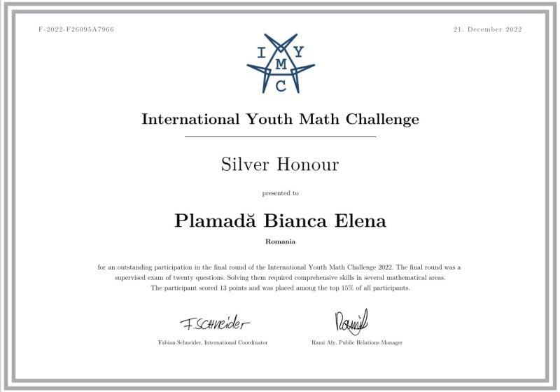 Prin cunoștințe matematice și gândire creativă, eleva Plamadă Bianca-Elena, din clasa a XII-a A la Colegiul Național „Grigore Ghica” Dorohoi, a reușit să obțină onoarea de argint. Ea s-a situat printre primii 15% din totalul participanților (de peste 5500).
