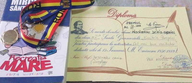 Aceștia și-au dovedit pentru câteva clipe talentul actoricesc prin memorarea unor creații poetice aparținând poetului Mihai Eminescu și recitarea lor în cadrului Concursului Cel mai bun recitator. Ce-ți doresc eu ție, dulce Românie!, La arme, Luceafărul, Lacul sunt doar câteva dintre poemele pe care elevii școlii noastre le-au pregătit pentru concurs, acestea fiind texte emblematice ale liricii eminesciene.