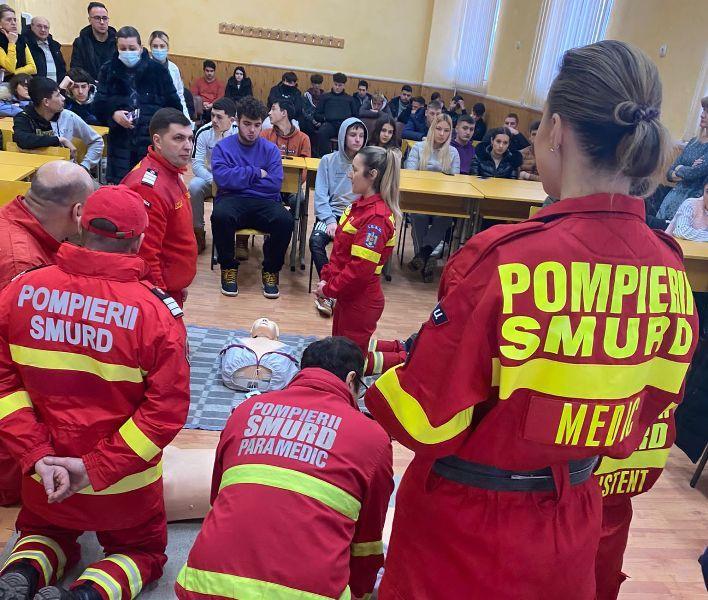 Astăzi, elevii Liceului Tehnologic „Petru Rareș” din municipiul Botoșani au participat la activitățile de pregătire desfășurate de o echipă formată dintr-un medic, trei asistenți și trei paramedici din cadrul U.P.U. – SMURD, șase elevi ai Școlii postliceale „Prof. Dr. Doc. Enescu Longinus”, precum și un reprezentant al Compartimentului Promovarea Sănătății și Educație pentru Sănătate din cadrul DSP Botoșani.