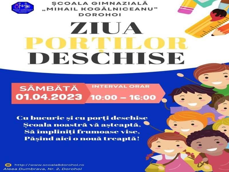Cu ocazia evenimentului dedicat „Porților Deschise”, Școala Gimnazială „Mihail Kogălniceanu” din Dorohoi vă invită în data de 1 Aprilie 2023, între orele 10:00 și 16:00, să vizitați și să participați totodată la activitățile propuse de cadrele didactice ale școlii.