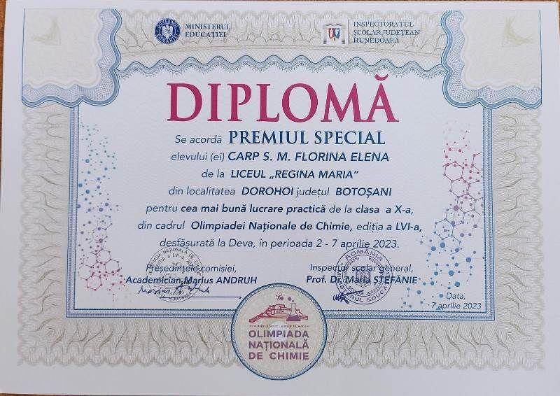 Din lotul județului Botoșani au făcut parte și Flavia Agheorghițoae și Florina Carp, eleve în clasa a X-a la Liceul „Regina Maria”, iar rezultatele lor fac cinste județului Botoșani și sunt dovada că pasiunea pentru studiul chimiei, dorința de a performa și excelența sunt ingredientele unor rezultate merituoase.