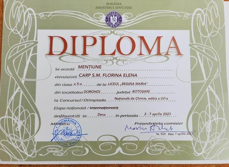 Afișarea rezultatelor finale a confirmat faptul că fetele de la „Regina Maria” și-au îndeplinit onorant participarea la etapa națională a olimpiadei, oferind motive de satisfacție d-rei prof. Mariana Sandu, cea care le-a coordonat, cu rigoare și dăruire, pregătirea.