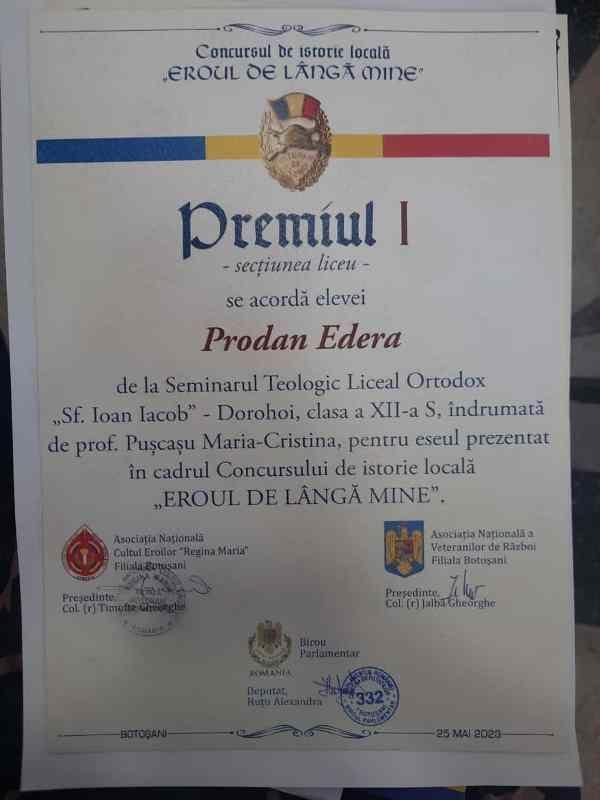 Ziua Înǎlțǎrii Domnului este și ziua comemorǎrii eroilor care și-au dat viața pentru dǎinuirea ființei noastre naționale, o zi cu puternicǎ încǎrcǎturǎ emoționalǎ pentru români. Cu acest prilej, pe 25 mai, la Cercul Militar Județean, a avut loc premierea elevilor participanți la concursul de istorie localǎ, Eroul de lângǎ mine, eleva Prodan Edera, de la Seminarul Teologic Liceal Ortodox „Sf. Ioan Iacob’’ Dorohoi, coordonatǎ de dna. Prof. Pușcașu Maria-Cristina, obținând premiul I, secțiunea liceu, cu un eseu în care a descris evenimentele prin care a trecut un veteran aflat încǎ în viațǎ, participant la al Doilea Rǎzboi Mondial. Eseul a fost realizat, în urma discuțiilor purtate de elevǎ, cu veteranul, fiind o experiențǎ foarte plǎcutǎ pentru aceasta.