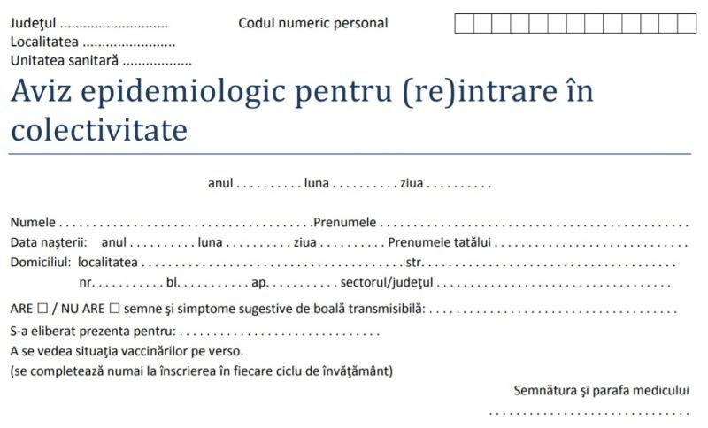 Astfel, medicul de familie eliberează documente medicale, respectiv adeverință medicală de înscriere în colectivitate, aviz epidemiologic și fișă de vaccinări, numai la înscrierea într-un nou ciclu de învățământ, adică pentru creșă, grădiniță, clasa pregătitoare, clasa a V-a și clasa a IX-a.