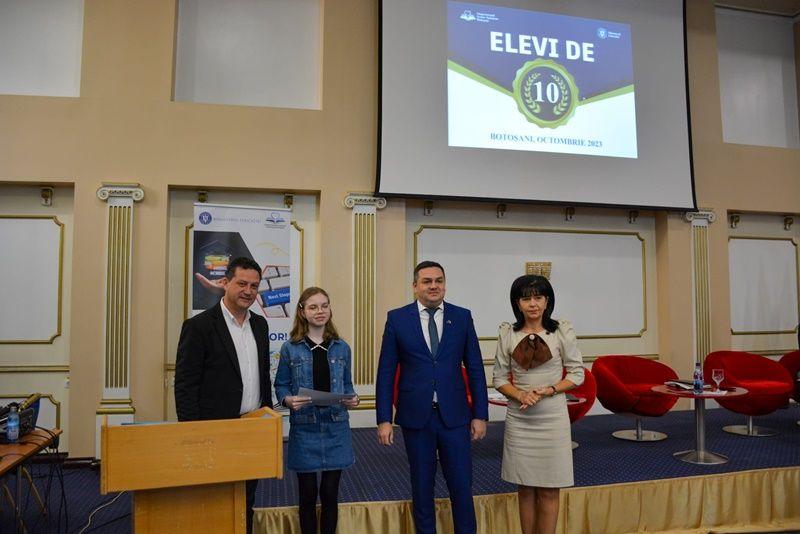 Sorin Cornilă, prefectul județului Botoșani: „Balan Amelia Alexandra, Crăciun Vlad, Patriu Marinela Larisa și Zamfirescu Ioana Antonia sunt elevii premiați astăzi pentru că au luat nota 10 la evaluarea națională. Felicitări și îmi doresc să ne reîntâlnim și peste 4 ani ca să vă premiem pentru că ați luat nota 10 și la Bacalaureat.