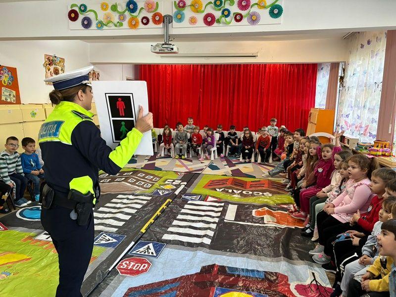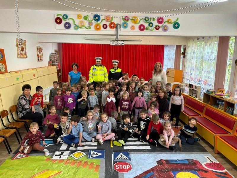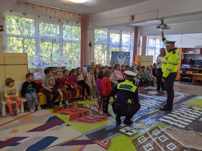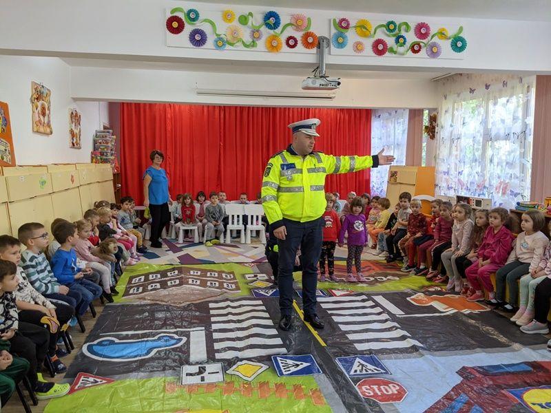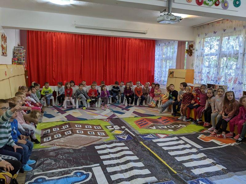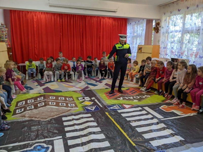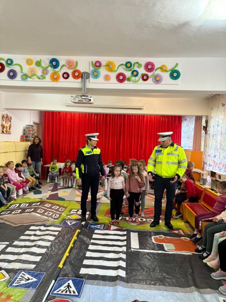 Într-o modalitate interactivă, cei mici s-au familiarizat cu indicatoarele rutiere și regulile de circulație, fiindu-le explicată semnificația și importanța fiecăruia, precum și modul de funcționare al semaforului pentru pietoni și pentru mașini.
