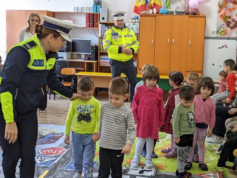 Polițiștii rutieri au fost în vizită, ieri, 16 noiembrie, la Grădinița cu program prelungit nr. 15, din municipiul Botoșani, unde au desfășurat activități de informare și prevenire și le-au prezentat copiilor autospecialele de poliție.