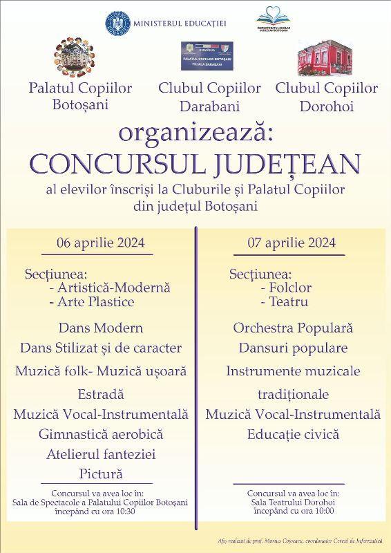 Sâmbătă și duminică, respectiv 6-7 aprilie 2024, începând cu ora 10.00, se va desfășura Concursul Judeţean al elevilor înscriși la Palatul Copiilor Botoșani, Clubul Copiilor Darabani și Clubul Copiilor Dorohoi.