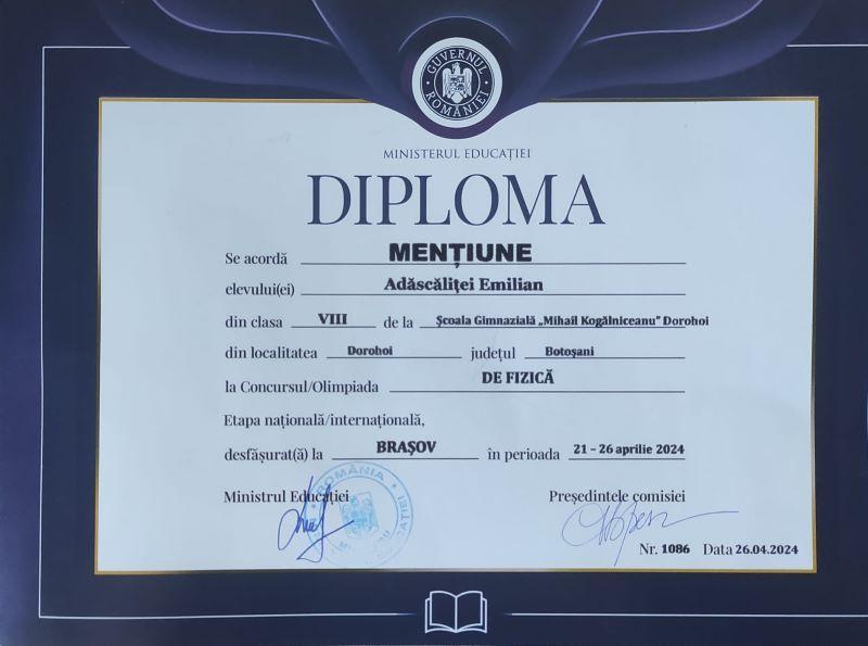 Și în acest an elevul Adăscăliței Emilian a participat la acest eveniment, obținând rezultate remarcabile: MENȚIUNE și MEDALIE DE ARGINT.