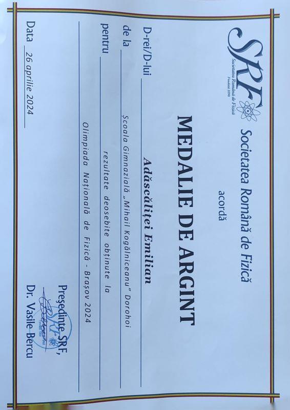 Emilian s-a calificat la Naționala Olimpiadei de Fizică 3 ani (clasele a VI-a, a VII-a, a VIII-a) ridicând prestigiul Școlii Gimnaziale „Mihail Kogălniceanu” Dorohoi, din punct de vedere al competițiilor școlare.
