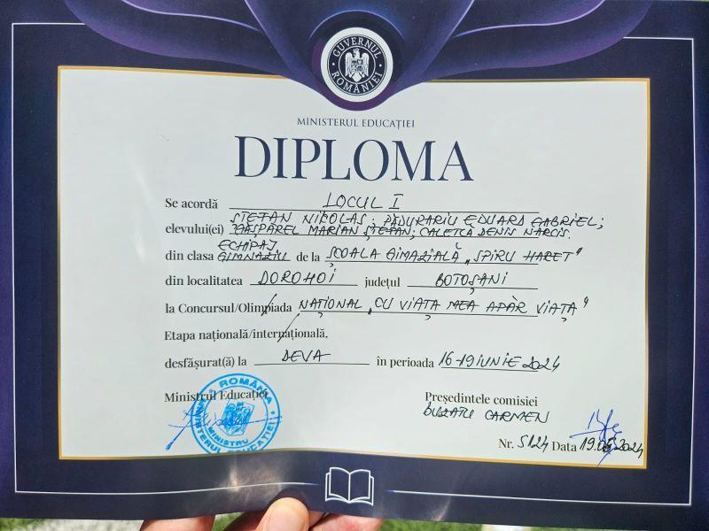 Echipajul Școlii Gimnaziale „Spiru Haret” Dorohoi a reprezentat județul Botoșani și regiunea de nord a Moldovei la etapa națională a concursului cu tematică de protecţie civilă „Cu viaţa mea apăr viaţa”, desfășurat la Deva în perioada 16-19 iunie, obținând un meritat premiu I.