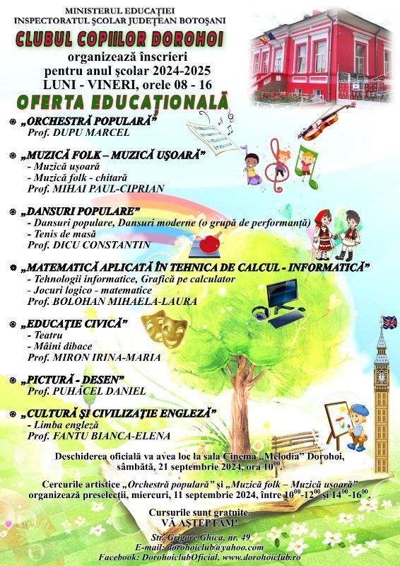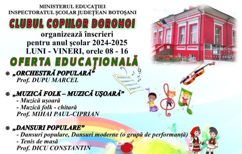 Părinții, copiii și elevii din municipiul Dorohoi şi localităţile alăturate sunt aşteptaţi la Clubul Copiilor Dorohoi între orele 08:00-16:00, de luni până vineri, pentru înscrierea la activitățile instructiv-educative din oferta educațională a cercurilor care vor funcţiona în anul școlar 2024-2025: