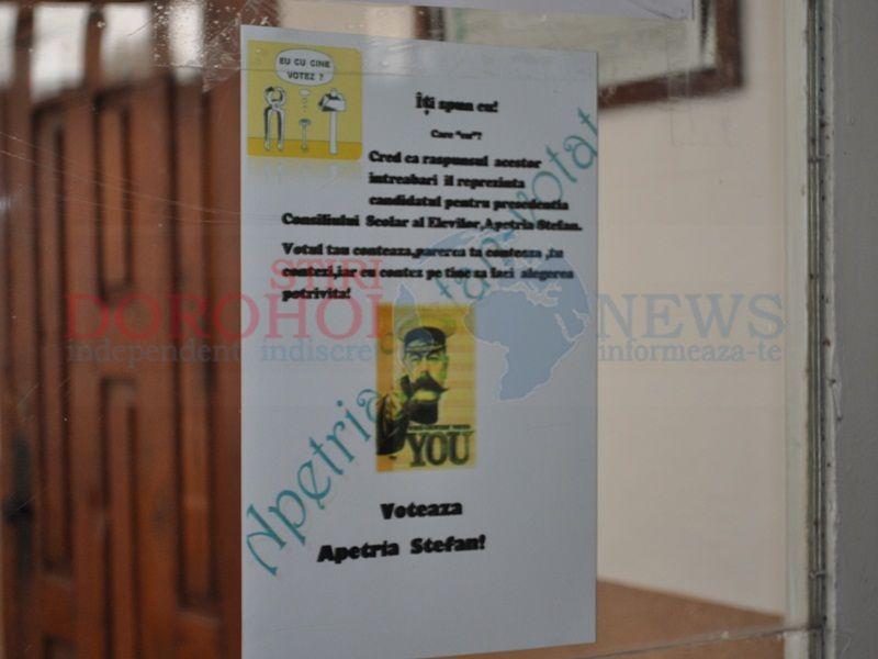 Astăzi, se va afla rodul campaniei celor şapte elevi înscrişi în cursa pentru cele patru posturi din consiliul şcolar al elevilor. Pentru postul de președinte s-au înscris doi candidați, Apetriea Ştefan Gabriel(11D) şi Buhăeanu Diana(11A), iar pentru cele trei posturi de vicepreşedinţi s-au înscris cinci candidați, Rotaru Alexandru(9A), Amarie Larisa(10E), Cronț Alexandru(11A), Ursachi Eva(10D) și Vasilache Laura(9D). Elevii s-au înscris pe platforma special creată pentru ei, adică wedu.ro.