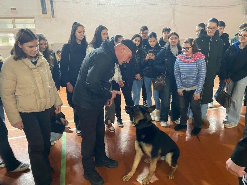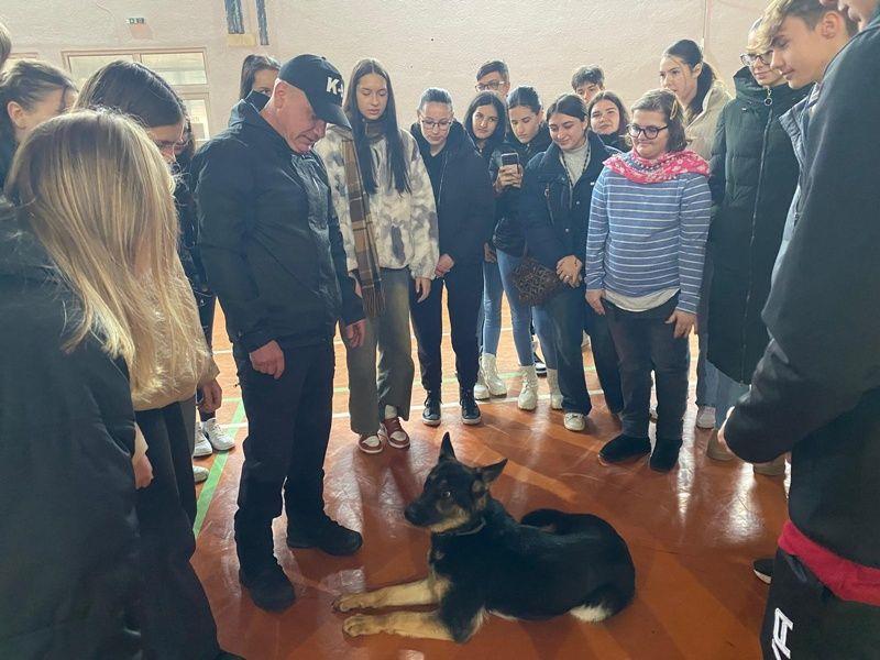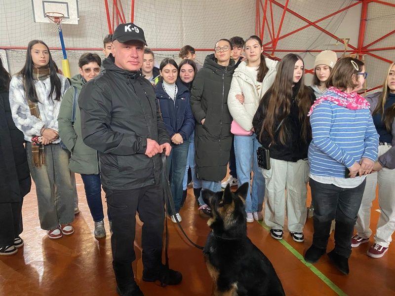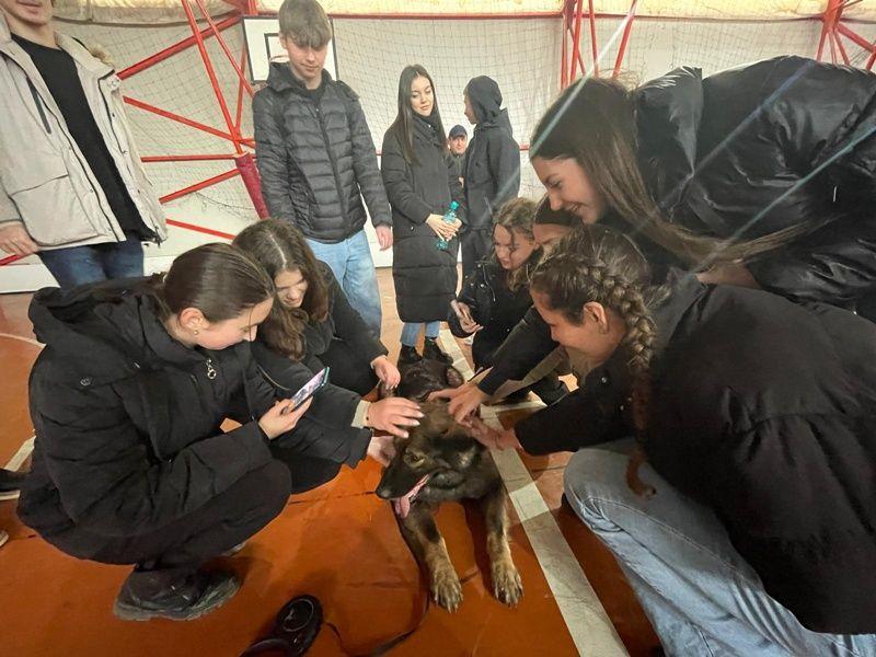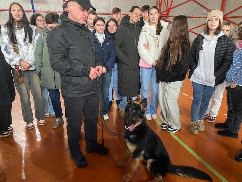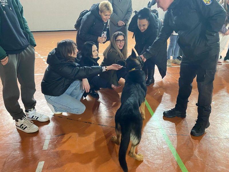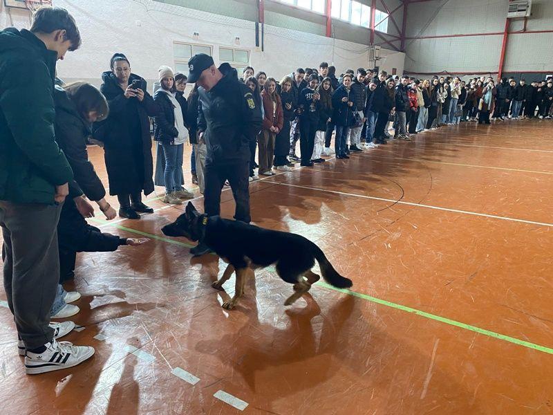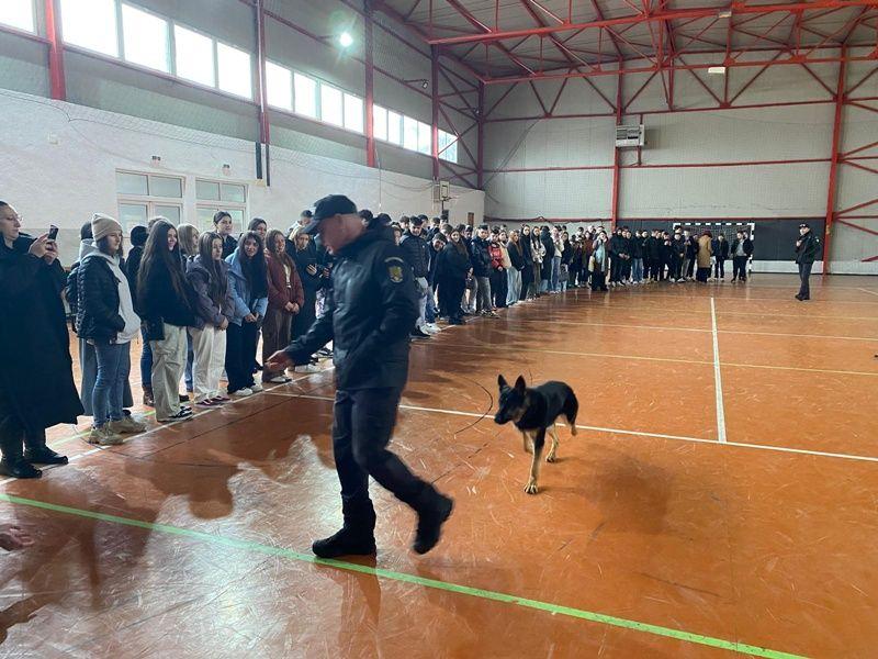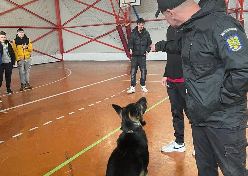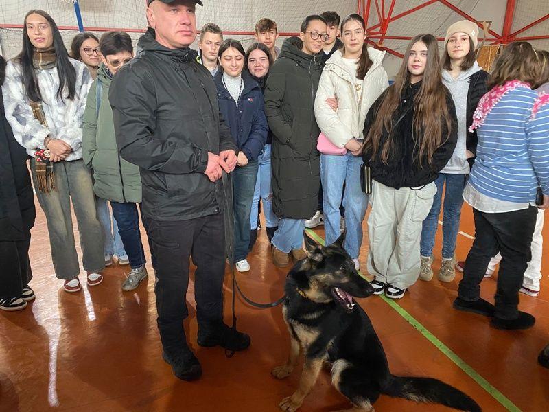 O întâlnire cu Adar, Kapa și Kali. Trei membri ai echipei Poliției de Frontieră Dorohoi, însoțindu-și cu tot devotamentul partenerii umani. Ați înțeles, desigur, că este vorba despre trei câini, iar prezența lor în fața liceenilor nu putea să producă decât încântare.
