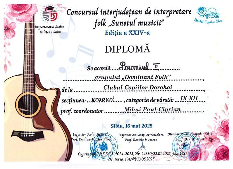 Clubul Copiilor Dorohoi, din nou pe podiumul festivalurilor de muzică din țară. În data de 16 mai 2025 a avut loc la Biblioteca „Astra” din Sibiu a XXIV–a ediţie a Festivalului de interpretare a muzicii folk „Sunetul muzicii”, festival organizat de Palatul Copiilor Sibiu, cu sprijinul Primăriei şi Conciliului Local Sibiu.