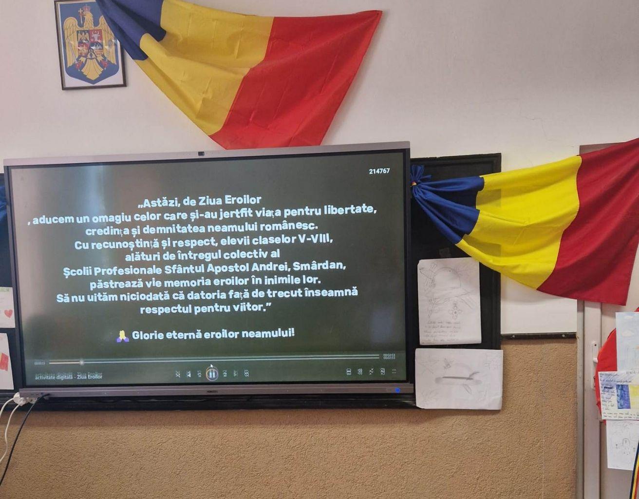 In cadru Școlii Profesionale „Sf. Ap. Andrei” Smârdan, elevii și cadrele didactice, au marcat această sărbătoarea prin desfășurarea proiectul educativ „CINSTIRE EROILOR NEAMULUI ROMÂNESC”, menit să trezească în inimile tinerilor generații, respectul pentru cei care, de-a lungul istoriei, au luptat cu credință și curaj pentru binele țării. De la Mihai Viteazul și Avram Iancu, până la eroii celor două Războaie Mondiale și martirii Revoluției din 1989, elevii au redescoperit figuri emblematice ale istoriei naționale și dăruirea acestora pentru România noastră de astăzi.