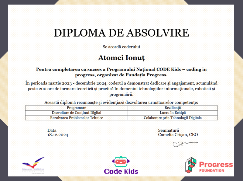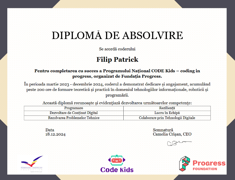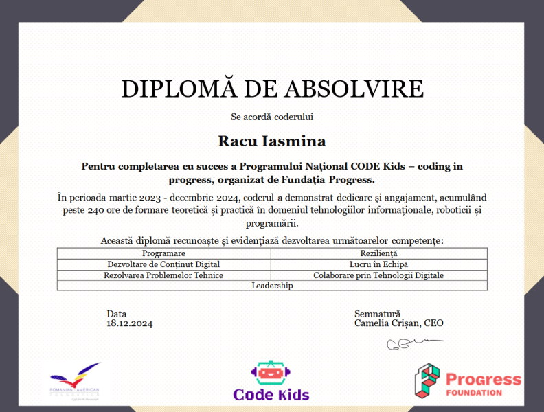Unul dintre proiectele de succes este CODE Kids – Copiii descoperă programarea în bibliotecile publice, care a oferit oportunitatea unui grup de 12 copii să pătrundă în universul programării și al tehnologiei. În cadrul Clubului de Programare organizat în bibliotecă, copiii au explorat noțiuni digitale, au creat proiecte interactive și au învățat să lucreze în echipă. Rezultatul? Mai mult decât cunoștințe tehnice – o generație care privește viitorul cu încredere și optimism.