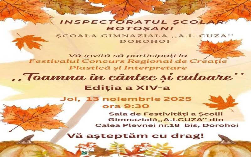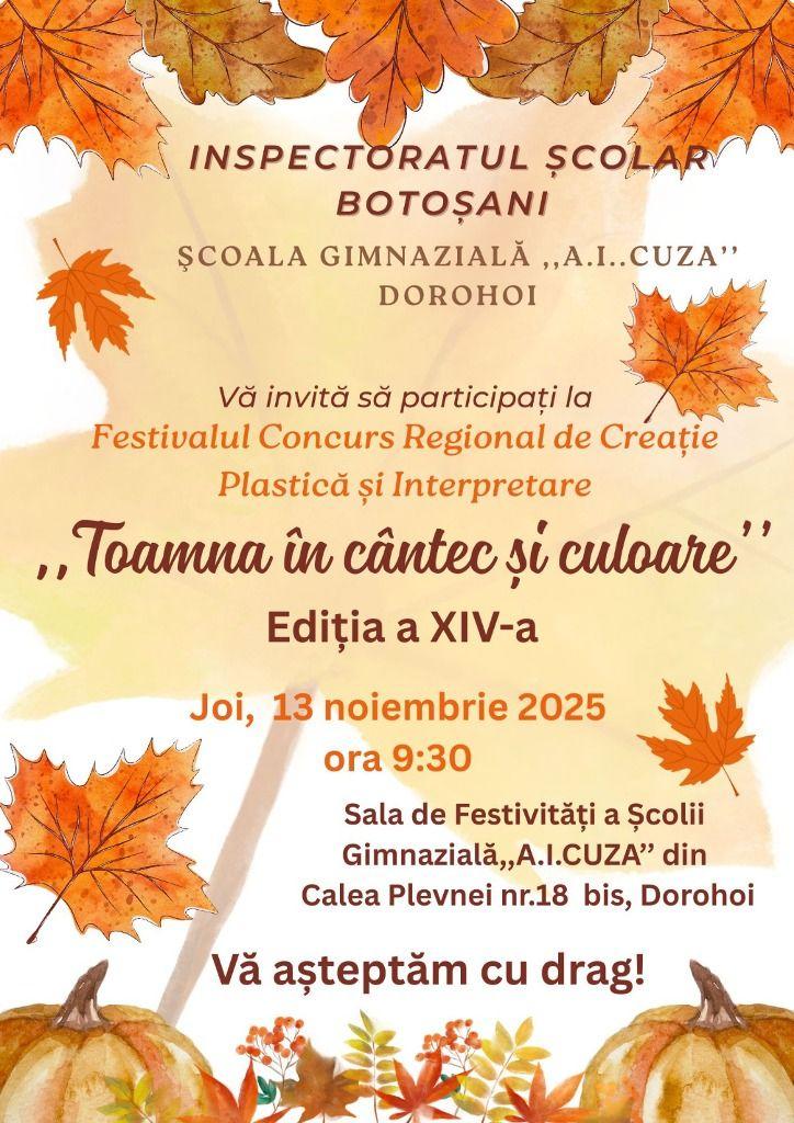Școala Gimnazială „A.I.Cuza” are onoarea de a vă invită să participaţi în data de 13 noiembrie 2025, în Sala de festivităţi a unităţii din Calea Plevnei Nr 18 bis, la cea de-a XIV-a ediţie a Festivalului Concurs Regional „Toamna în cântec şi culoare”.
